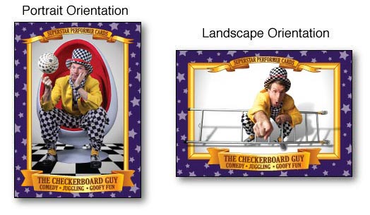 I do my best to make everything work well between all concerned, but once your order has been placed, all questions about your order should be directed to Jeff at: info@eastvangraphics.ca. Also, it should be noted that I receive no money when you place an order. This keeps the cost of the cards to you the performer as low as possible. So what's in it for me? Well, I continue to enjoy the dream that these cards will one day become super valuable... Once they do, I'll make a bundle selling them on ebay! So, what's next? Customizing your card's layout... For the Front of the cards, choose a landscape or portrait orientation and pick colors for the border and accent areas on the card... If your not sure about colors Jeff at East Van Graphics will make the choices based on the picture(s) that you send in.